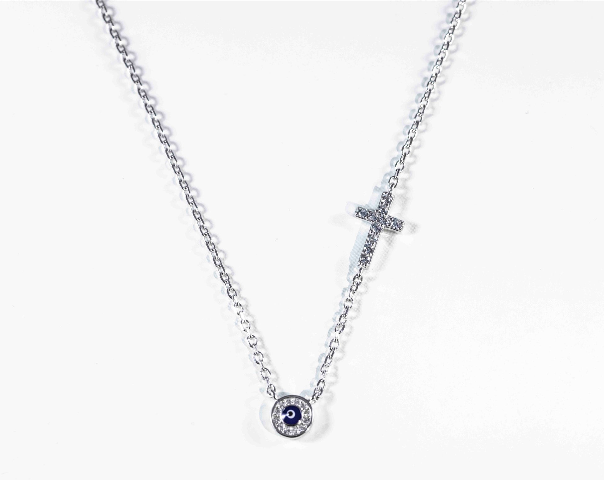 A delicate eye and cross necklace , wear this piece for protection from evil eye and faith. An effortless piece that makes a statement.